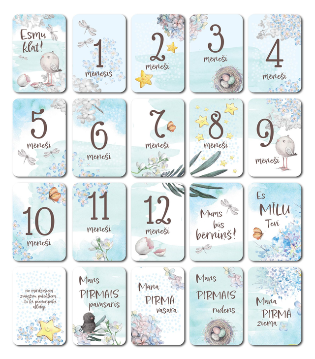 Mēnešu kartiņas lieliski noderēs, gan fotogrāfējot mazuli pirmos 12 mēnešus, gan veidojot mazuļa pirmo fotoalbumu!